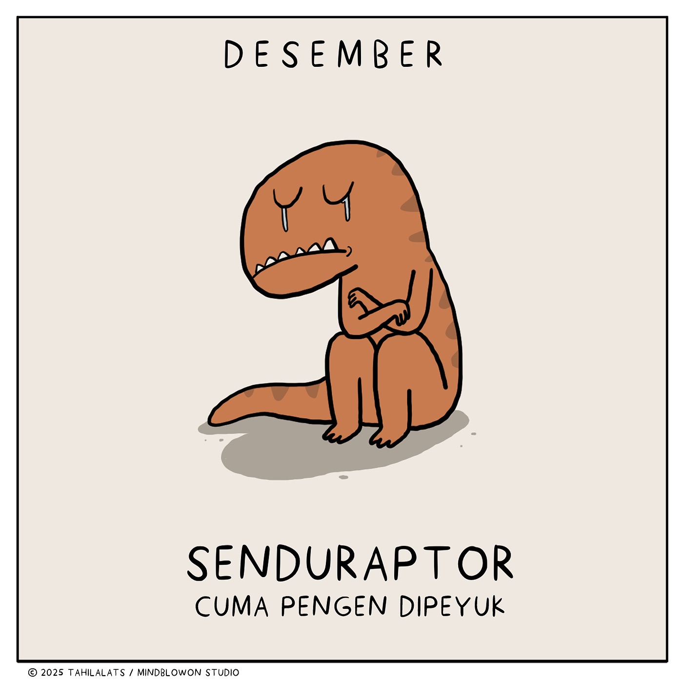 Mari kita mulai dengan "Desember Senduraptor." Dinosaurus yang satu ini digambarkan dengan mata berkaca-kaca, tangan menyilang, dan posenya yang sendu. Kata-kata "Cuma pengen dipeluk" semakin menegaskan perasaan yang sedang dialaminya. Ilustrasi ini mewakili perasaan kesepian atau butuh perhatian yang seringkali muncul di akhir tahun, saat kita merenungkan pencapaian dan kegagalan sepanjang tahun. Ini adalah momen ketika kita mungkin merasa rentan dan membutuhkan dukungan dari orang-orang terdekat.