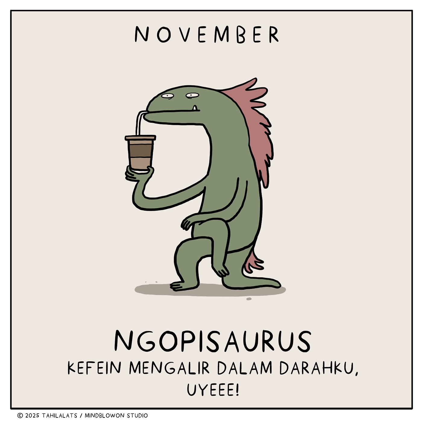Selanjutnya, ada "November Ngopisaurus." Dinosaurus berwarna hijau ini digambarkan sedang menyeruput kopi dengan ekspresi puas. Kata-kata "Kafein mengalir dalam darahku, uyeee!" menggambarkan ketergantungan kita pada kopi untuk menghadapi hari yang sibuk. Kopi sudah menjadi bagian tak terpisahkan dari rutinitas banyak orang, terutama di era serba cepat ini. Ilustrasi ini adalah representasi lucu dari bagaimana kita mengandalkan kopi untuk meningkatkan energi dan fokus.