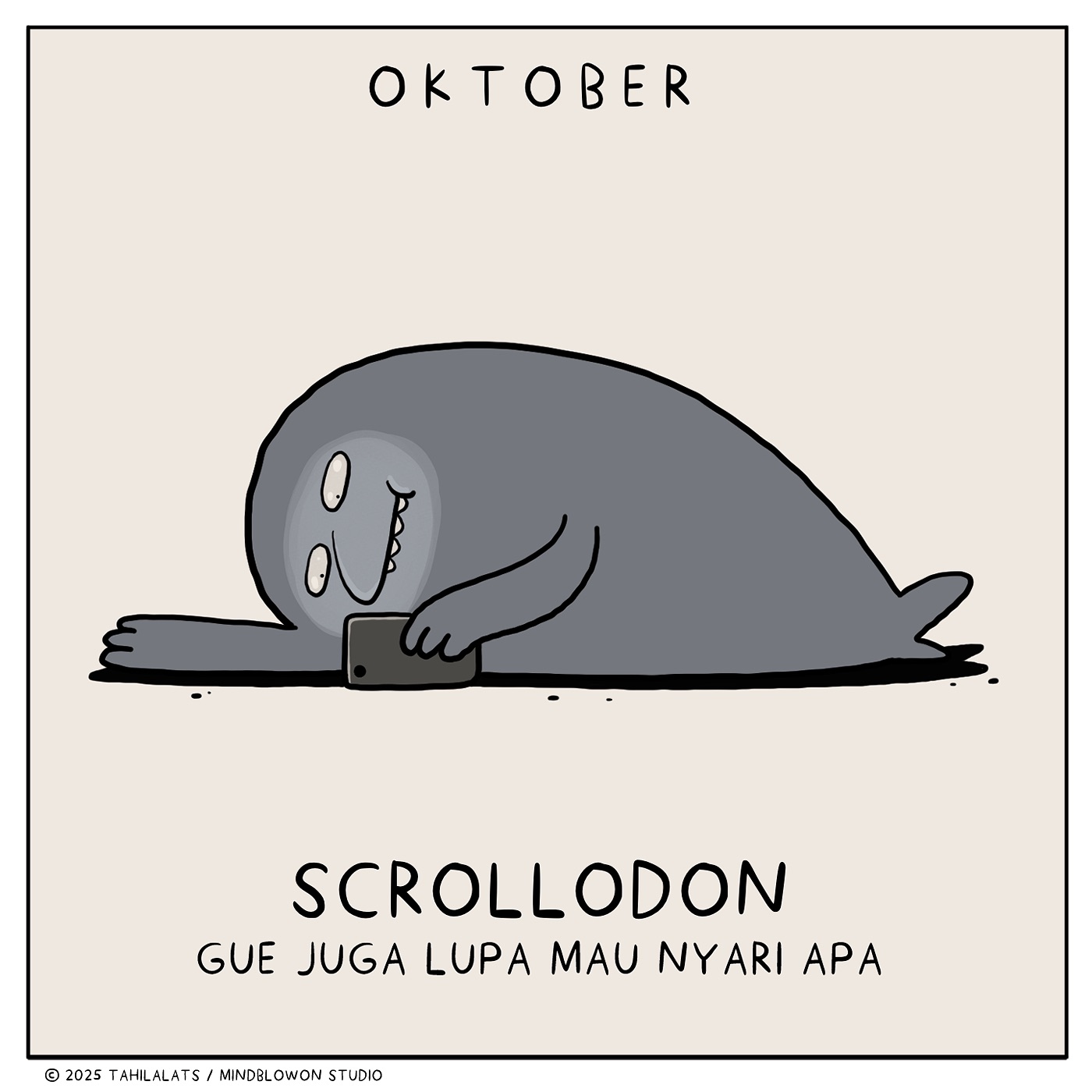 Kemudian, kita punya "Oktober Scrollodon." Dinosaurus berbentuk seperti anjing laut ini sedang asyik scrolling di ponselnya. Kata-kata "Gue juga lupa mau nyari apa" menggambarkan kebiasaan kita yang seringkali tanpa tujuan jelas saat menggunakan media sosial. Kita seringkali terjebak dalam pusaran informasi yang tak ada habisnya, hingga lupa apa yang sebenarnya ingin kita cari. Ilustrasi ini adalah sindiran halus tentang bagaimana media sosial bisa membuat kita kehilangan fokus dan membuang-buang waktu.