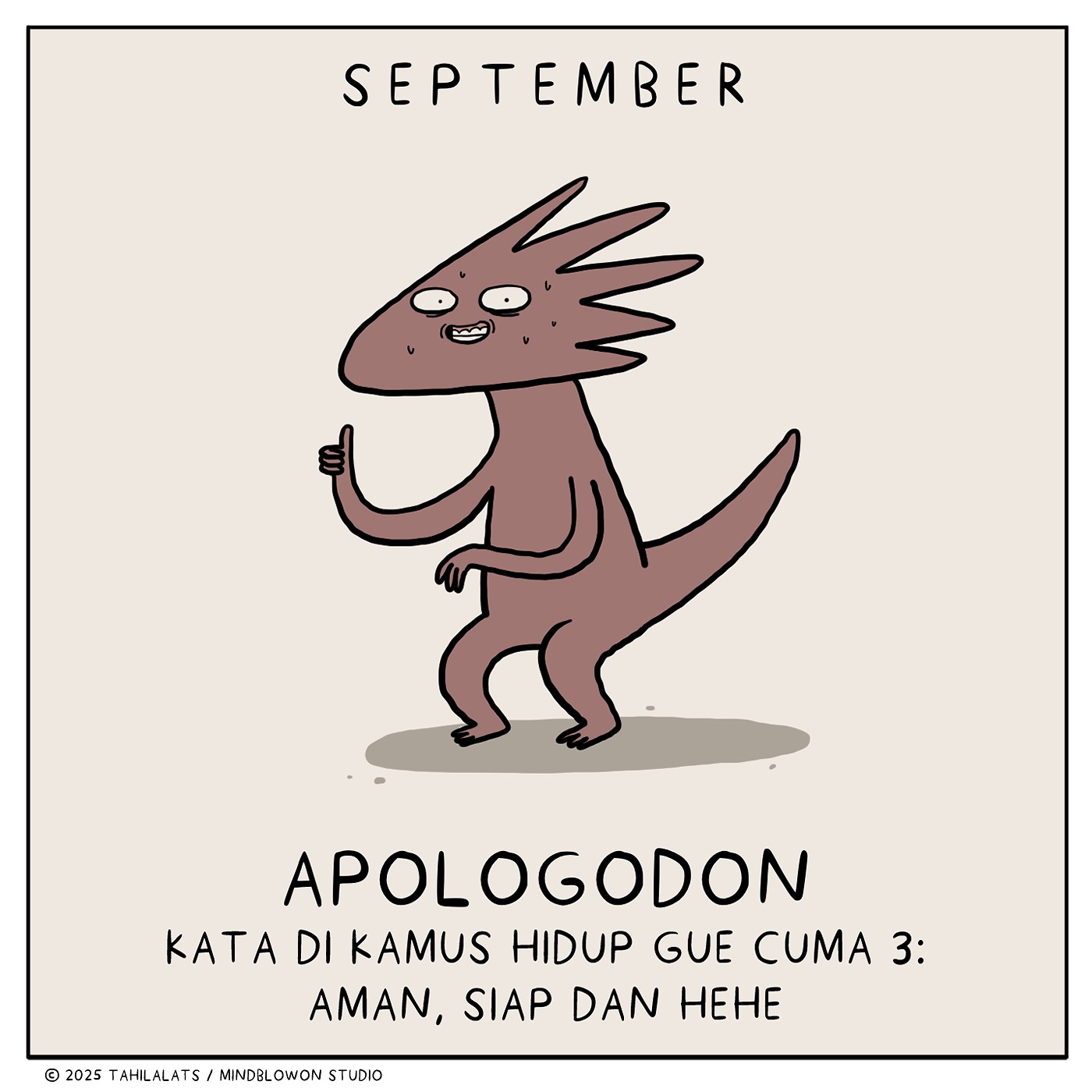 Terakhir, ada "September Apologodon." Dinosaurus ini digambarkan dengan ekspresi kikuk dan mengangkat jempol. Kata-kata "Kata di kamus hidup gue cuma 3: Aman, Siap, dan Hehe" menggambarkan orang yang terlalu sering meminta maaf atau menghindari konflik. Ilustrasi ini adalah representasi dari orang-orang yang mungkin memiliki rasa tidak aman atau takut untuk mengungkapkan pendapatnya secara langsung.