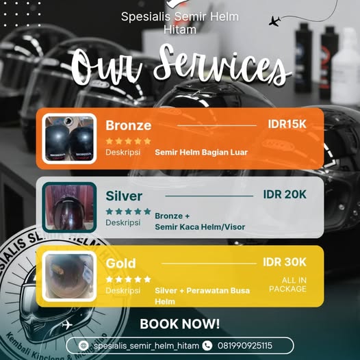- Bronze (IDR 15K): Layanan ini berfokus pada semir helm bagian luar. Ini adalah opsi yang tepat jika Anda hanya ingin menghilangkan kusam dan membuat helm terlihat lebih bersih. Gambar memperlihatkan contoh helm Honda yang sudah disemir. Harga yang ditawarkan juga sangat terjangkau.
