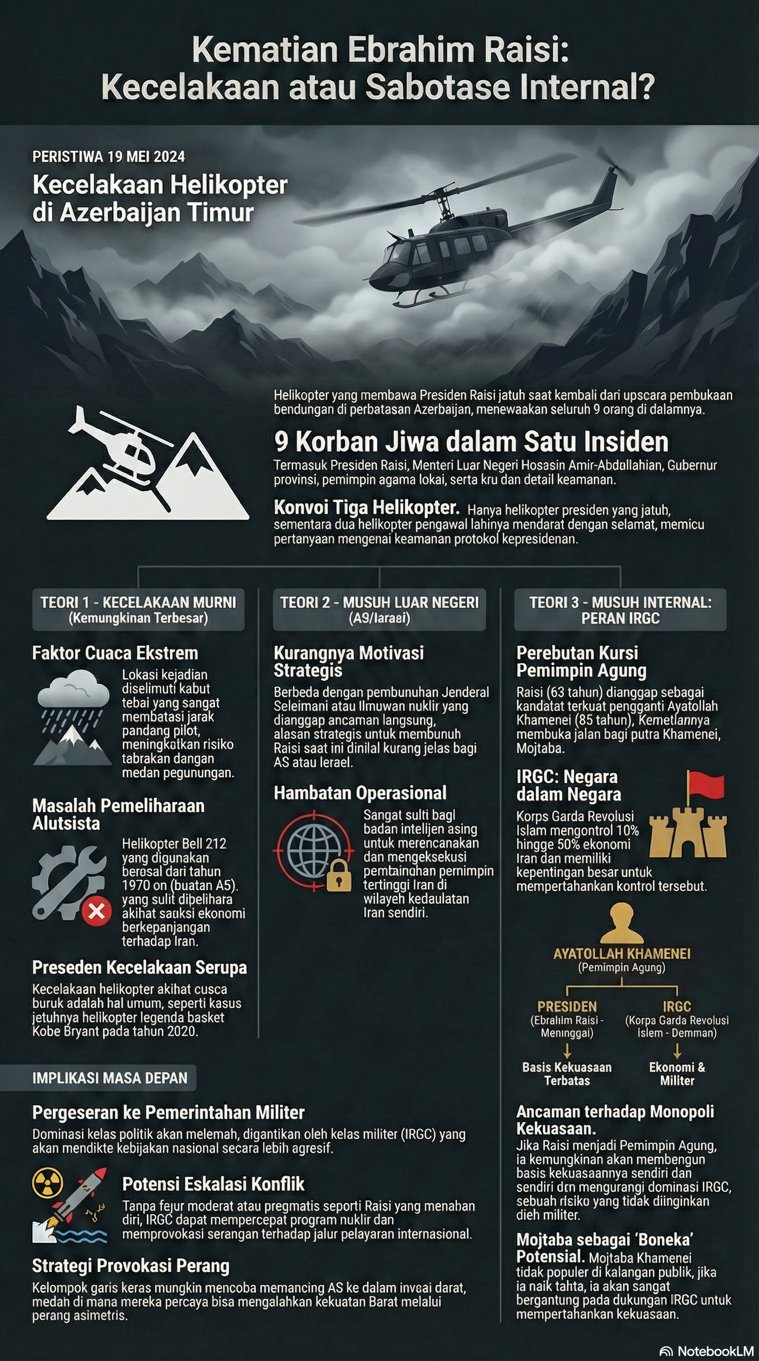 Analisis ini memberikan sorotan khusus pada peran Korps Garda Revolusi Islam (IRGC) sebagai pihak yang paling diuntungkan jika ingin mempertahankan monopoli kekuasaan dan kebijakan luar negeri yang agresif. Penulis berpendapat bahwa kematian Raisi dapat memuluskan jalan bagi Mostafa Khamenei untuk menjadi Pemimpin Agung berikutnya, yang dipandang lebih mudah dikendalikan oleh militer. Selain itu, teks ini menjelaskan ketegangan antara faksi politisi moderat yang menginginkan stabilitas ekonomi dengan faksi militer radikal yang siap memicu konflik terbuka melawan Amerika Serikat dan Israel. Akhirnya, sumber tersebut menyimpulkan bahwa jika peristiwa ini merupakan pembunuhan berencana, maka dunia akan melihat peningkatan provokasi militer dan percepatan program nuklir Iran di masa depan