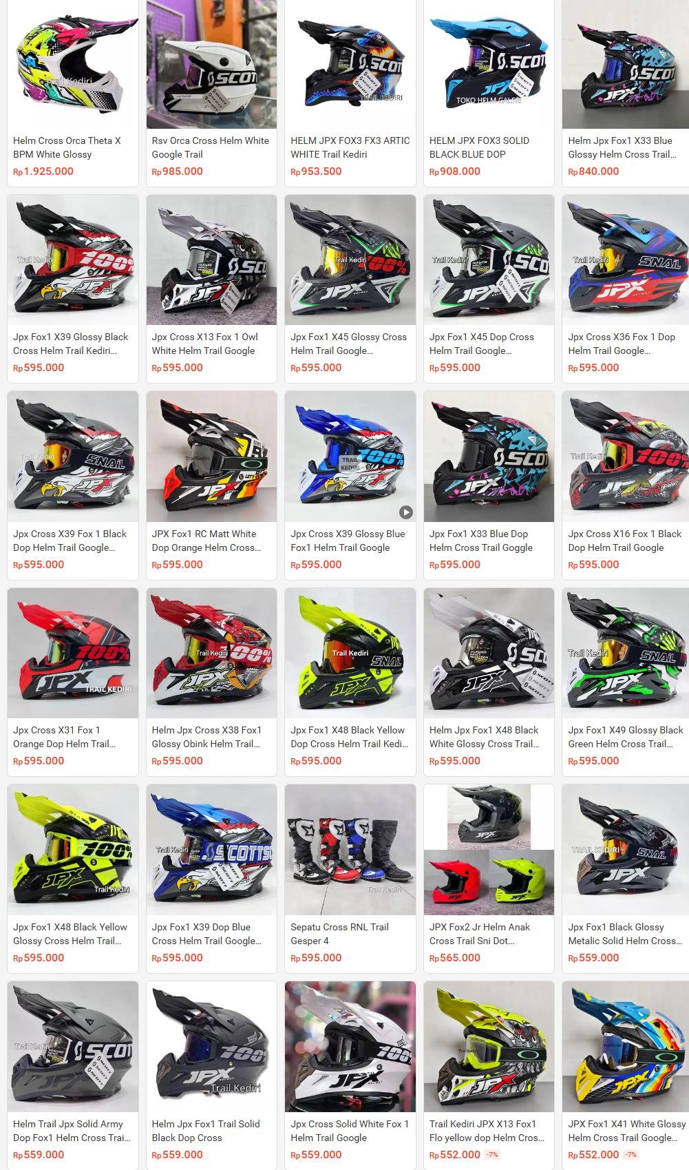 - HELM JPX FOX3 FX3 ARTIC WHITE Trail Kediri: Helm ini menawarkan desain yang lebih modern dengan kombinasi warna putih dan aksen biru. Harga Rp 953.500 sebanding dengan kualitas dan tampilannya yang sporty.
