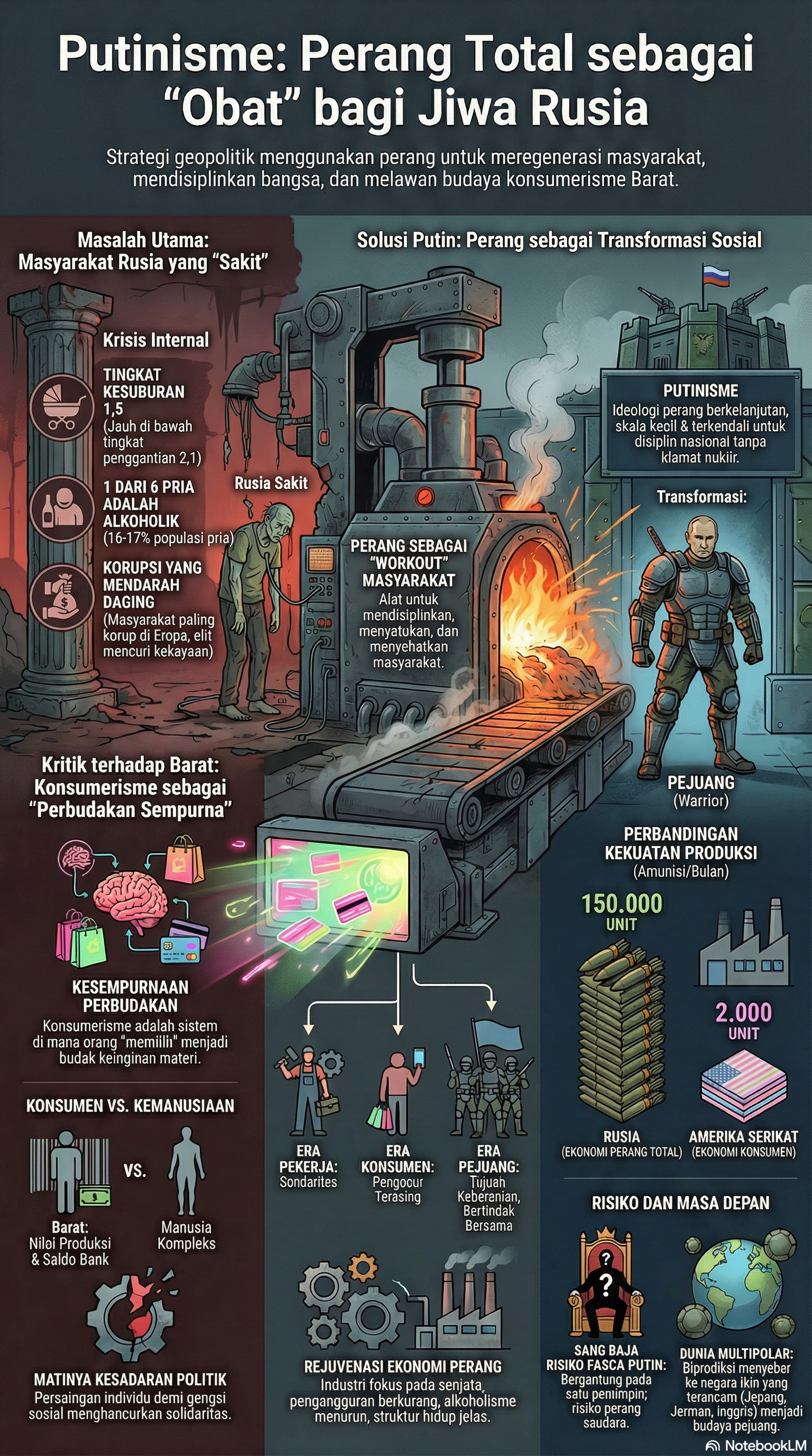 Membahas pandangan Vladimir Putin yang menggunakan perang sebagai alat untuk melakukan transformasi radikal terhadap masyarakat Rusia. Narasi ini menjelaskan bahwa Putin menganggap budaya konsumerisme Barat telah merusak jiwa bangsa, yang memicu masalah kronis seperti korupsi, alkoholisme, dan penurunan populasi.