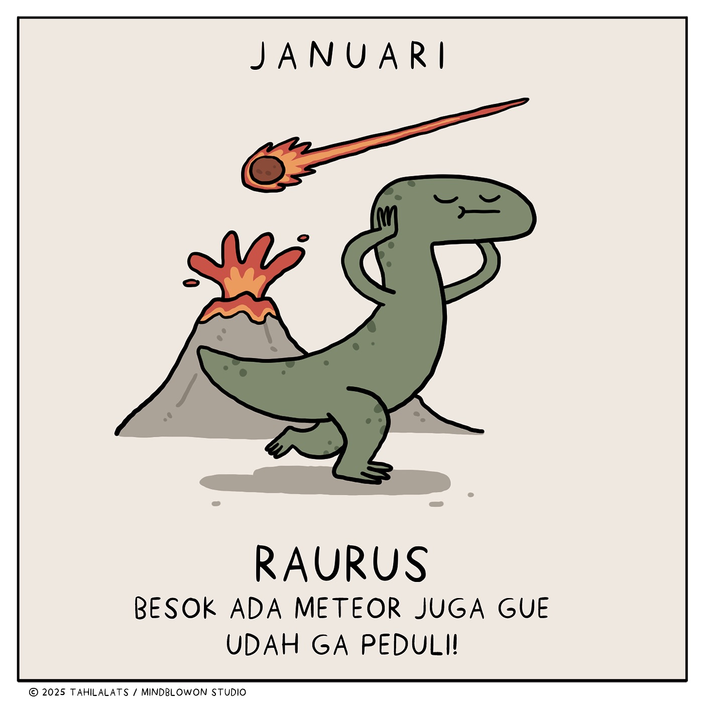 Ilustrasi Raurus menggambarkan seekor dinosaurus hijau yang memasang pose cuek sambil melirik meteor yang meluncur mendekat dan gunung berapi yang meletus. Pesannya jelas: "Besok ada meteor juga gue udah nggak peduli!" Awal tahun seringkali terasa berat dengan ekspektasi dan tekanan. Raurus menjadi representasi sempurna dari perasaan burnout dan apatis yang sering menghantui kita di bulan Januari. Fakta: Banyak survei menunjukkan bahwa Januari sering disebut sebagai "Blue Monday", hari paling menyedihkan dalam setahun. Tips: Jangan terlalu memaksakan diri di awal tahun. Istirahat yang cukup dan fokus pada hal-hal yang membuatmu bahagia.