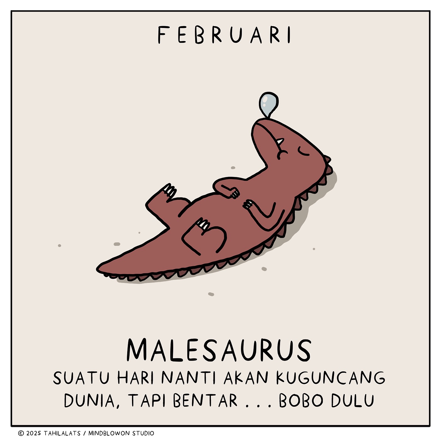 Malesaurus, dinosaurus berwarna coklat kemerahan yang sedang rebahan santai dengan gelembung mimpi di atas kepalanya. Captionnya: "Suatu hari nanti akan kuguncang dunia, tapi bentar… bobo dulu". Ilustrasi ini menggambarkan rasa malas dan prokrastinasi yang sering menyerang kita. Kita punya banyak mimpi dan rencana, tapi godaan untuk menunda-nunda selalu lebih besar. Data: Sebuah studi dari University of Colorado Boulder menemukan bahwa rasa malas seringkali disebabkan oleh kurangnya motivasi dan rasa takut gagal. Tips: Pecah tujuan besar menjadi langkah-langkah kecil yang lebih mudah dicapai. Beri dirimu hadiah setiap kali menyelesaikan satu langkah.