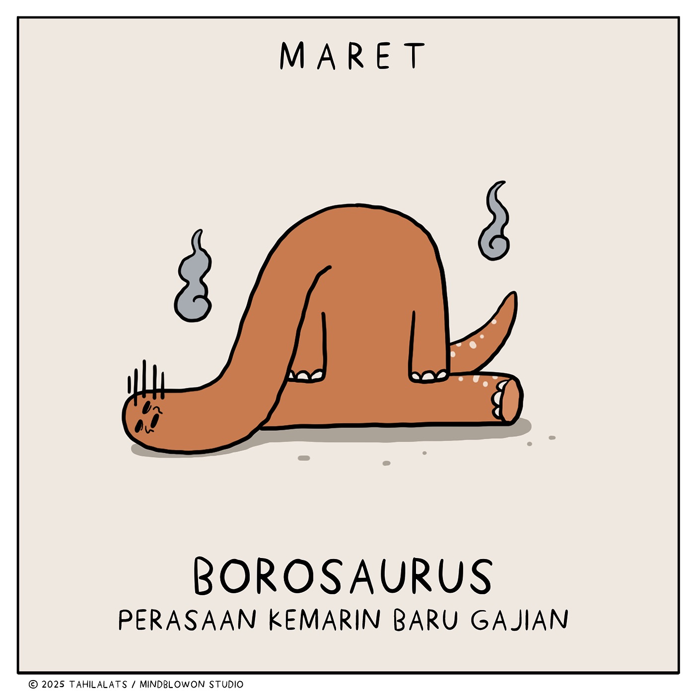 Borosaurus digambarkan dengan posisi telungkup lesu, dengan asap mengepul dari tubuhnya, menggambarkan kelelahan setelah menghabiskan gaji. Captionnya yang menohok: "Perasaan kemarin baru gajian". Maret seringkali menjadi bulan yang berat secara finansial setelah euforia gajian di akhir Februari. Ilustrasi ini mengingatkan kita tentang pentingnya mengelola keuangan dengan bijak. Contoh Real-World: Banyak orang terjebak dalam siklus "gajian-foya-bokek" setiap bulannya. Tips: Buat anggaran bulanan, prioritaskan kebutuhan, dan alokasikan dana untuk tabungan.