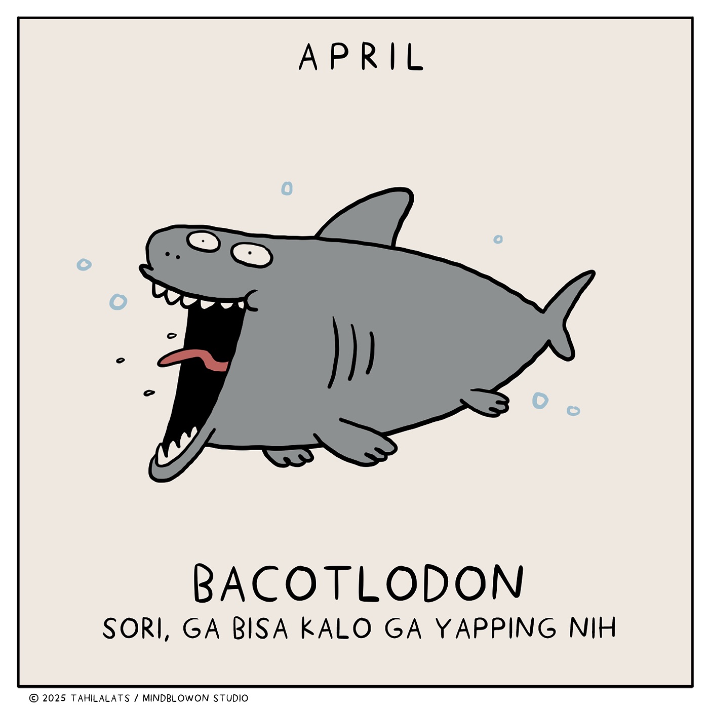 Bacotlodon, seekor hiu abu-abu dengan mulut menganga lebar dan gigi menyeringai, melambangkan orang yang suka berbicara tanpa henti. Captionnya yang jujur: "Sori, ga bisa kalo ga yapping nih". April seringkali dipenuhi dengan obrolan ringan dan gosip. Ilustrasi ini menyindir kebiasaan kita untuk berbicara lebih banyak daripada mendengarkan. Fakta: Penelitian menunjukkan bahwa mendengarkan aktif dapat meningkatkan hubungan interpersonal dan mengurangi konflik. Tips: Cobalah untuk lebih banyak mendengarkan daripada berbicara. Ajukan pertanyaan terbuka dan tunjukkan ketertarikan pada apa yang dikatakan orang lain.